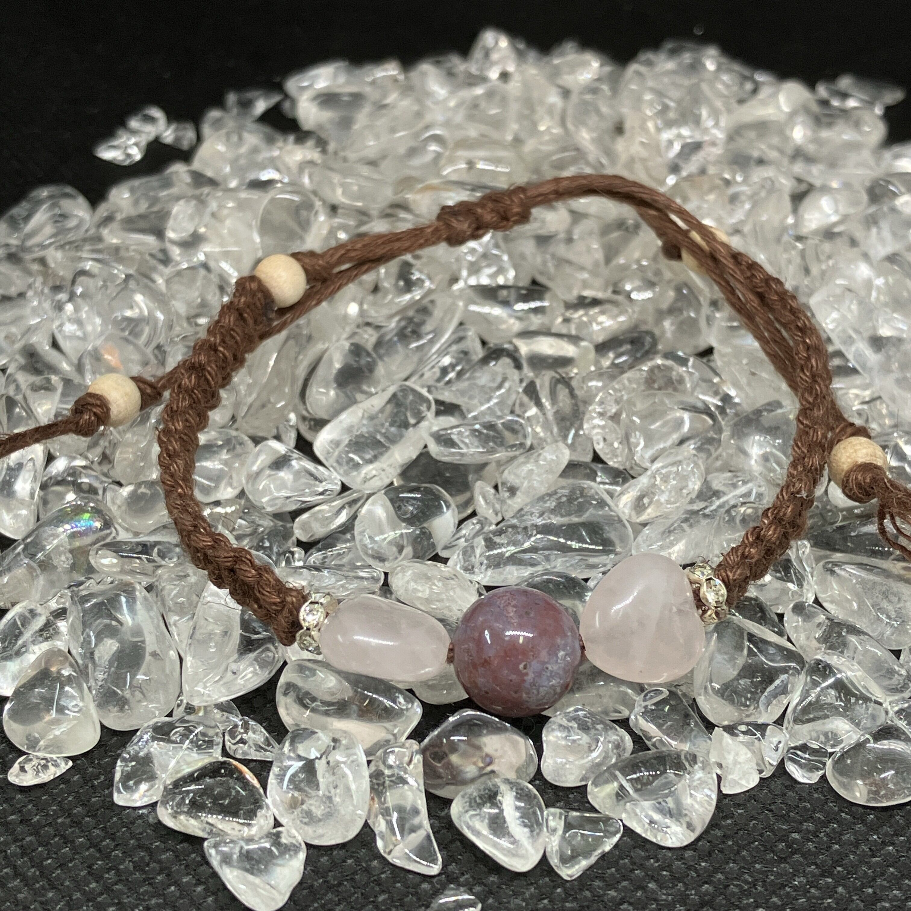 ・素材:モスアゲート、ローズクォーツ、ヘンプコード。